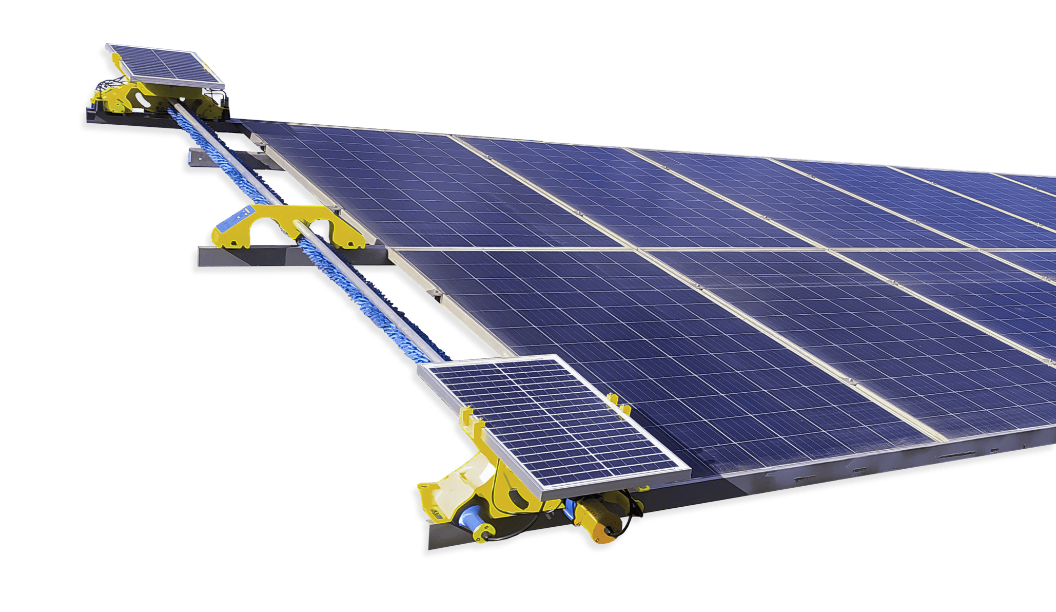 Ecológico e eficiente, o SolarWash Work utiliza cerdas macias, proporciona economia de água e garante limpeza uniforme, preservando a integridade dos painéis e aumentando a eficiência energética da planta.